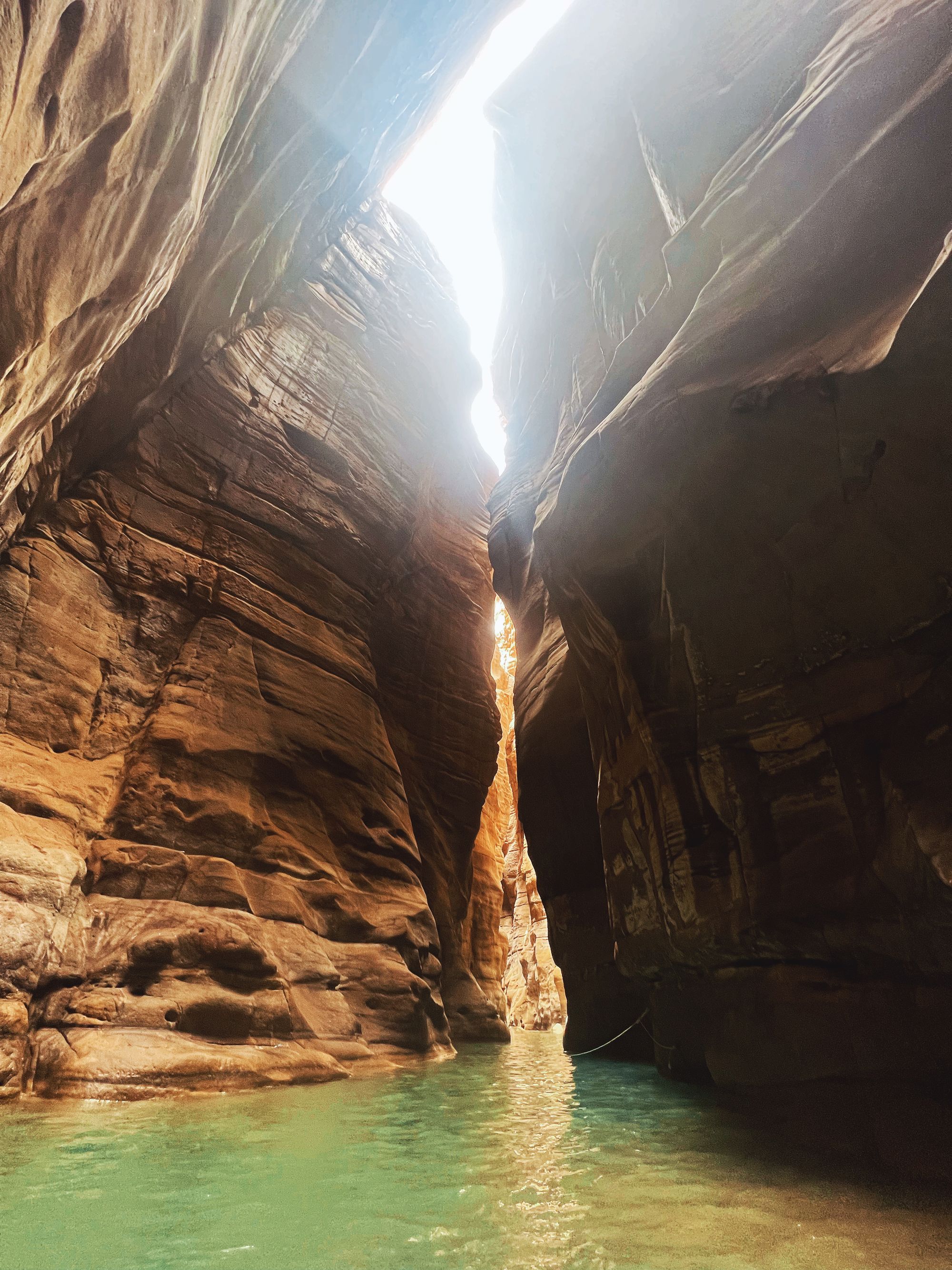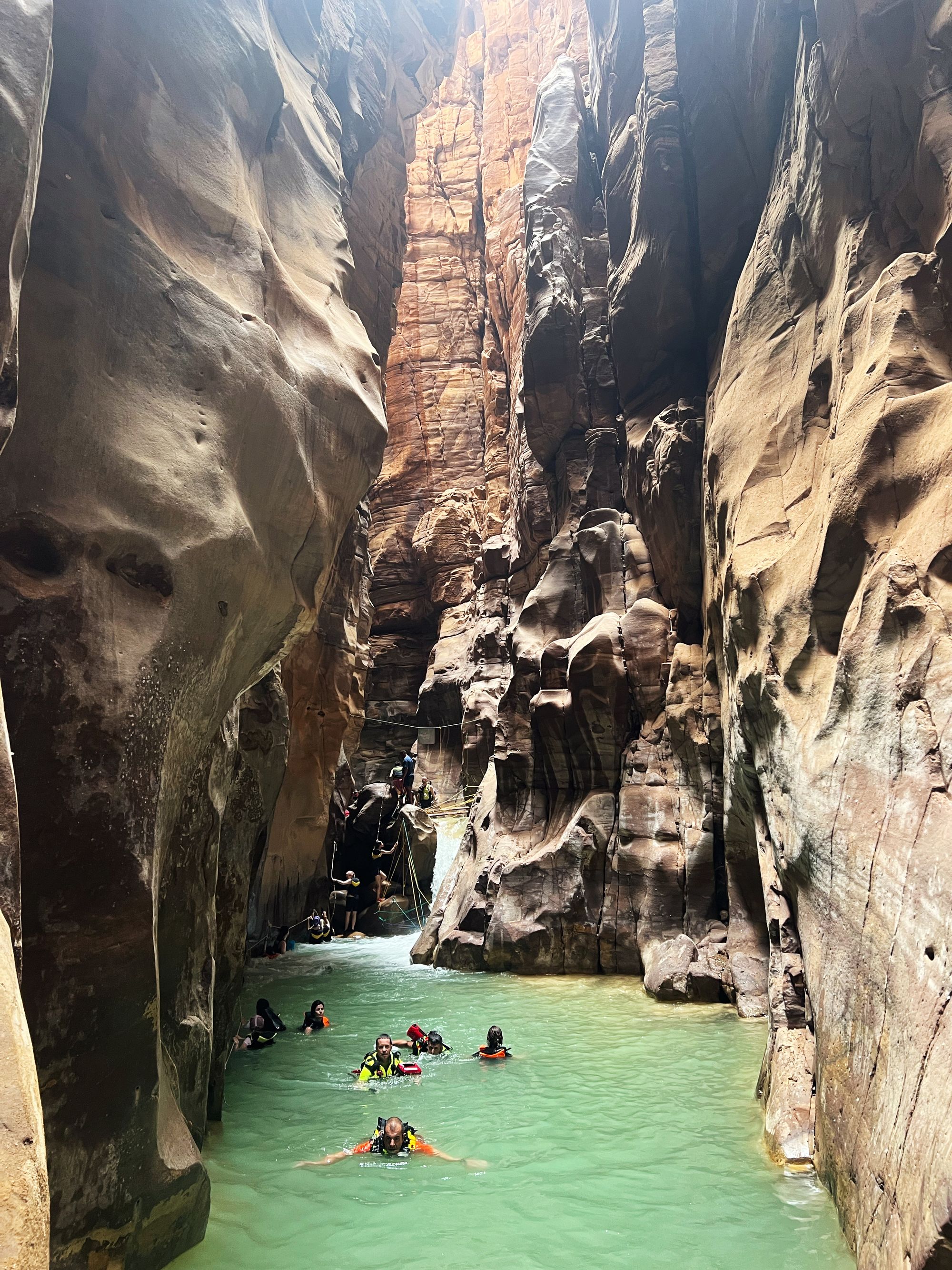 Wadi Mujib is a slot canyon similar to the Narrows in Zion where you hike up though the water. It was STUNNING!! I took my phone, a water bottle, my favorite dry bag, my wallet and of course the rental car keys. They recommend water shoes but honestly I hiked in my Allbirds and shoutout to them cause they were perfect for this adventure day. They require a life jacket and there is definitely some climbing over waterfalls and obstacles so prepare to use your upper body strength. It was beyond gorgeous and seriously so much fun. The man loves the water and was living his best life jumping in the pocket pools like a sexy mer-man. We hiked in a few miles to the end point which was a dual waterfall. There were several other people there when we arrived but we were happy to just relax and enjoy this otherworldly scene. Eventually we had it all to ourselves and ladies…..it was magical.